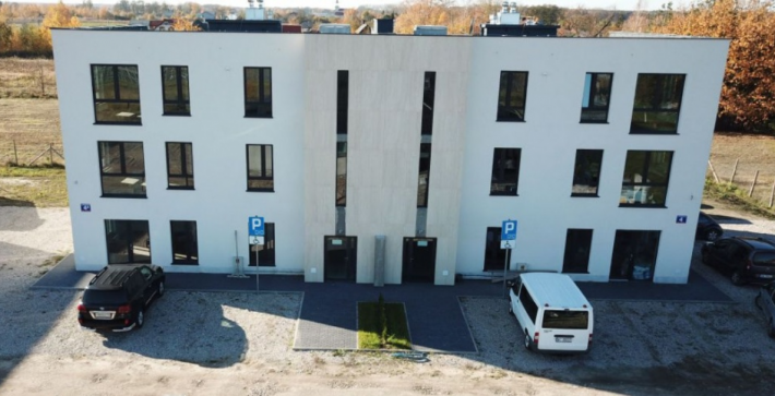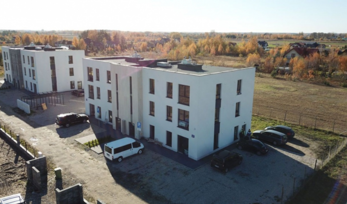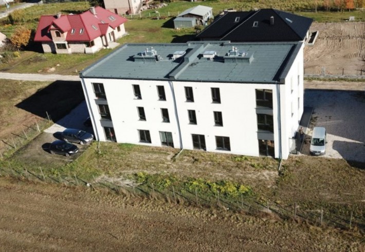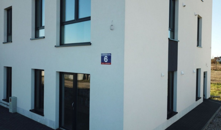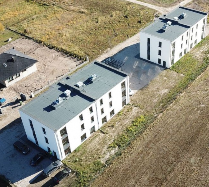 Dwupiętrowy blok mieszkalny na terenie zamkniętym, oddany do użytku w 2017 roku.