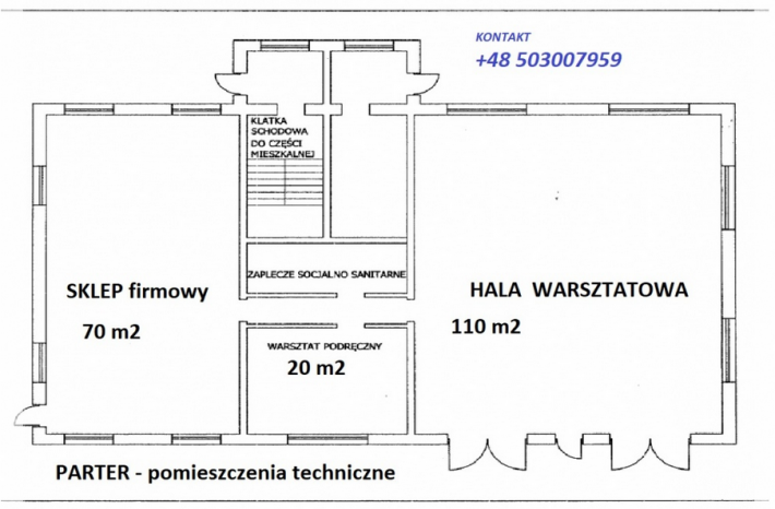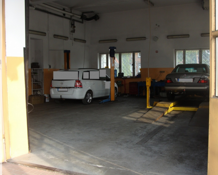 Parter budynku 230 m2 – zajmuje kompletnie wyposażony warsztat samochodowy z dwiema bramami wjazdowymi, czterema stanowiskami i dwoma podnośnikami. Ponadto oddzielne pomieszczenia sklepu i warsztatu podręcznego i zaplecze socjalno-sanitarne.