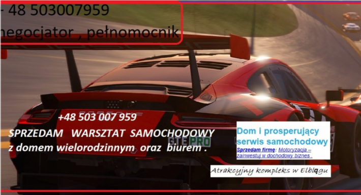 Firma działa na rynku od 2006 roku. Główne pkd firmy to 45.20.Z – Konserwacja i naprawa pojazdów samochodowych. Rozruszniki, Alternatory ,części -sprzedaż, naprawa. Firma dochodowa w ciągłym ruchu, duża baza kontrahentów oraz warsztatów współpracujących ,bardzo mała konkurencja -jedyna firma w regionie o takim profilu działalności .Doświadczona kadra mechaników z długoletnim stażem pracy. Duży warsztat z wyposażeniem. Sklep i magazyn z kierunkowym asortymentem. Firma zorganizowana na terenie działki w super dogodnymi warunkami w eksponowanym miejscu. Trasa wlotowa do miasta Elbląg. Organizacyjne połączenie z budynkiem mieszalnym daje możliwość pełnej kontroli wszystkich procesów w firmie Sprzedam kompleks usługowo mieszkalny.