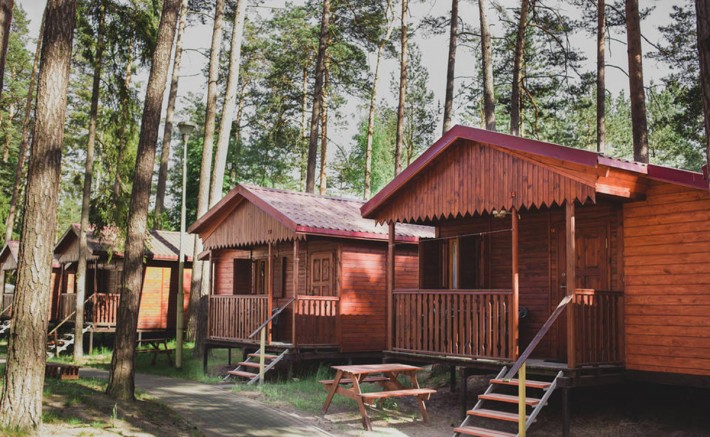 Domki drewniane 22 szt.: 14 parterowych 2-osobowych, 5 piętrowych 4-5 osobowych, 2 parterowe 3-osobowe, 1 parterowy bliźniaczy (2 x 4 osobowe). Wszystkie domki wyposażone w łazienkę z prysznicem, TV, radio, lodówka, czajnik, naczynia. Taras. Stoły piknikowe.
