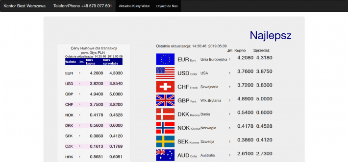 - Działająca strona www z aktualizacją kursów w dowolnym momencie, podział na kurs hurt oraz detal
