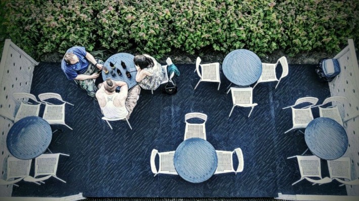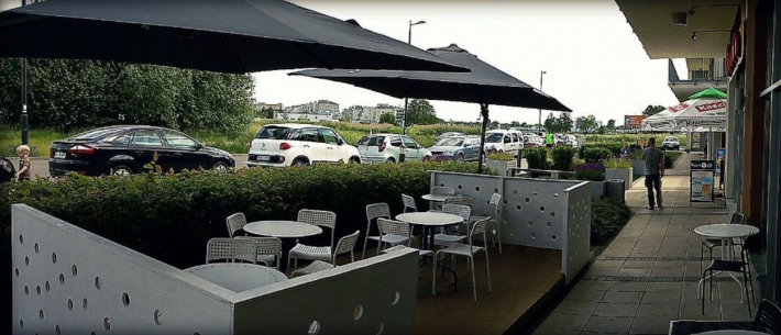 Do lokalu przynależy ogródek, wyposażony w stoliki, krzesła i parasole.