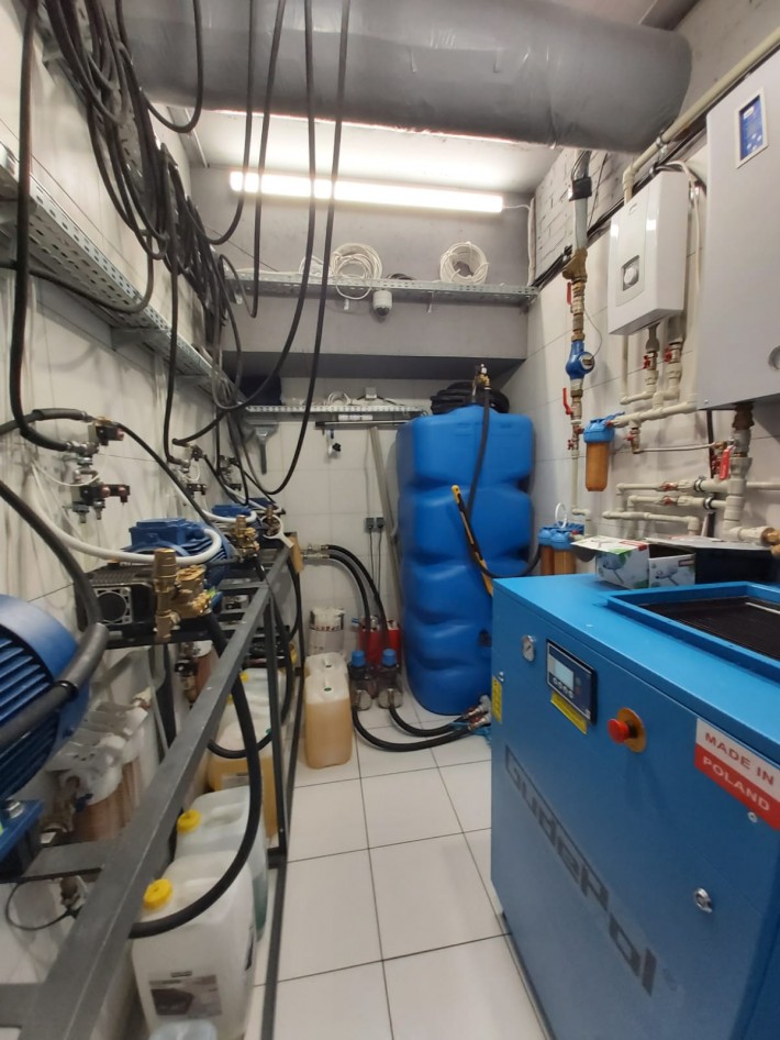 Myjnia zajmuje powierzchnię 191 m2. Jest ona całkowicie wyposażona w najnowocześniejsze rozwiązania technologiczne w tym miedzy innymi: profesjonalne urządzenia do mycia, odkurzacze, sprzęt do prania tapicerki, pianownice oraz wysoce wyspecjalizowany sprzęt do detailingu. W jej skład wchodzą cztery stanowiska robocze (mogące obsługiwać bezpośrednio cztery samochody), pomieszczenie techniczne, pomieszczenie dla personelu i designersko spersonalizowaną recepcję.