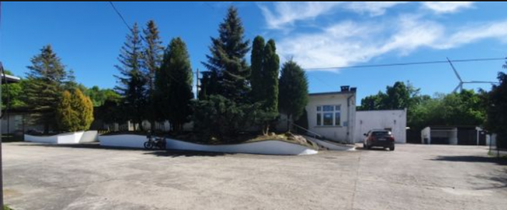Działka nr 1 – powierzchnia 0,84ha - Zabudowana jest czterema budynkami. Ciągi komunikacyjne, parking, plan manewrowy – utwardzone płytami betonowymi.
