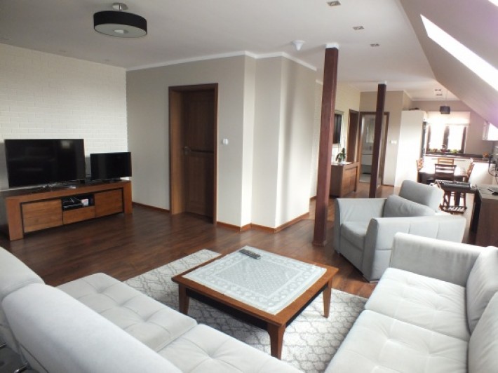 Dodatkowo na poddaszu znajduje się mieszkanie służbowe, które może również pełnić funkcję apartamentu hotelowego. Mieszkanie składa się z aneksu kuchennego z jadalnią, salonu, 2 sypialni, gabinetu oraz garderoby całość stanowi powierzchnię 95m2.
