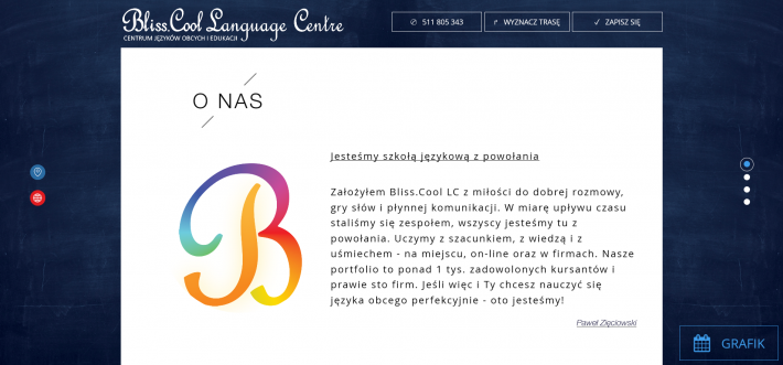 Przejęcie szkoły wraz uczniami, zobowiązujemy się przekazać cały know-how prowadzenia szkoły, wszystkie kontakty, wzory dokumentów oraz pomoc w sprawnym przejęciu zarządzania firmą. Cena zawiera również wszystkie projekty graficzne, bogate profile w mediach społecznościowych, aplikacjach mobilnych i online (Facebook, Instagram, Google, LinkedIn, Yelp, YouTube, Twitter, Whatsapp Business), stronę www wraz z domeną. Strona www jest nowoczesna, pięknie zaprojektowana, intuicyjna i responsywna, z funkcją wypełniania testów poziomujących dla 7 głównych języków europejskich oraz harmonogramem zajęć na cały rok szkolny z możliwością bezpośredniego rezerwowania terminów i rejestracji on-line. Strona www oparta jest o środowisko Joomla (z edytowalną funkcjonalnością całości strony oraz wsparciem zaprzyjaźnionego moderatora).