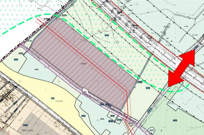 Uchwalony mpzp gminy dopuszcza zagospodarowanie zabudową produkcyjną wysokoenergochłonną, zabudową usługową, bazy, składy, magazyny składowania do 14m. Na te cele przeznaczone jest ok. 13ha, ok. 550metrów wzdłuż autostrady i ok.380 w głąb, w sąsiedztwie brak zabudowań. Przy głównej drodze dostępny prąd, gaz, woda, (ok. 400metrów). Teren idealnie równy z małym spadkiem w kierunku autostrady, bardzo ładna ekspozycja.