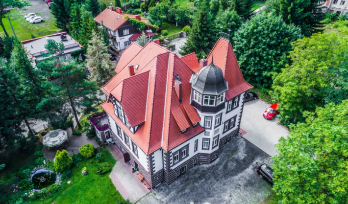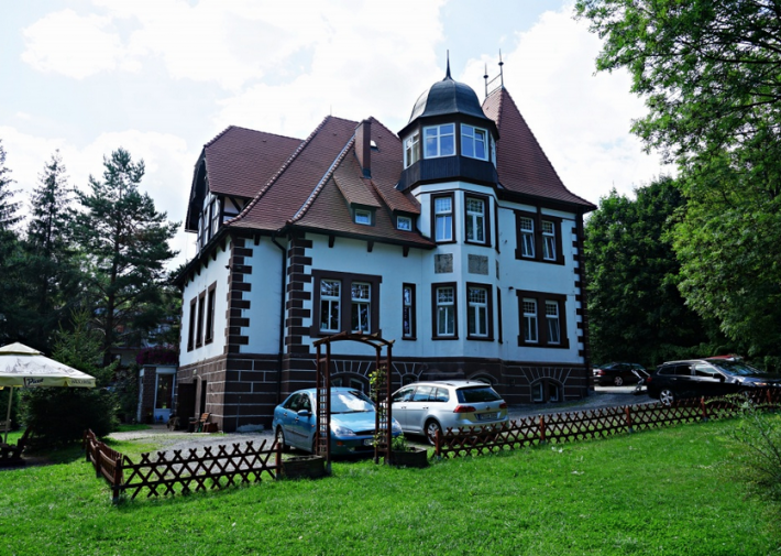 Mniejsza z działek o powierzchni 1046 m² zabudowana jest zabytkowym budynkiem z 1901 roku, spełniającym obecnie funkcję hotelu. Pałacyk odwiedzany jest przez turystów z różnych stron świata. Jego sercem niewątpliwie jest Hall, który ma wysokość dwóch kondygnacji z galeriowym korytarzem wokół, z którego są wejścia dookoła do poszczególnych pokoi. W hallu ściany oraz wysoki sufit obłożone są drewnem, drzwi do pokoi w starym stylu, duże, również drewniane nadają szczególnego charakteru. Na górę prowadzą piękne drewniane schody podparte na filarach sięgających aż do sufitu.
