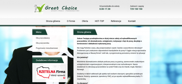 Great Choice to Agencja Pośrednictwa Pracy z wieloletnim doświadczeniem, specjalizująca się w logistyce oraz zarządzaniu zasobami ludzkimi. Firma z siedzibą główną w Pobiedziskach (województwo wielkopolskie) już od 3 lat realizuje różnorodne przedsięwzięcia branżowe – nie tylko lokalne, ale również globalne. Spółka zrzesza najlepszych z najlepszych – fachowców, którym na przestrzeni lat przyszło działać nie tylko w Polsce, ale również w USA, Kanadzie, Niemczech, a także na Litwie, Ukrainie i w Rosji.
